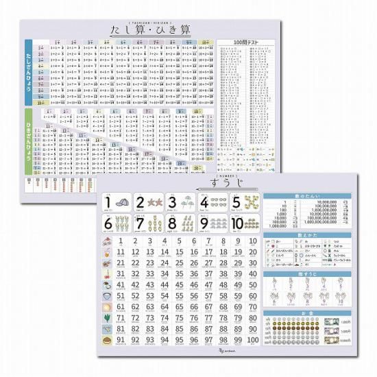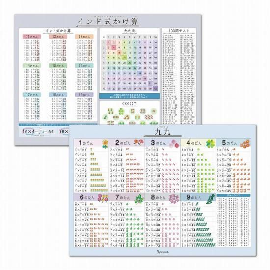 ■内 容:カレンダー1枚、すうじ1枚、たし算・ひき算1枚、九九1枚、インド式かけ算1枚