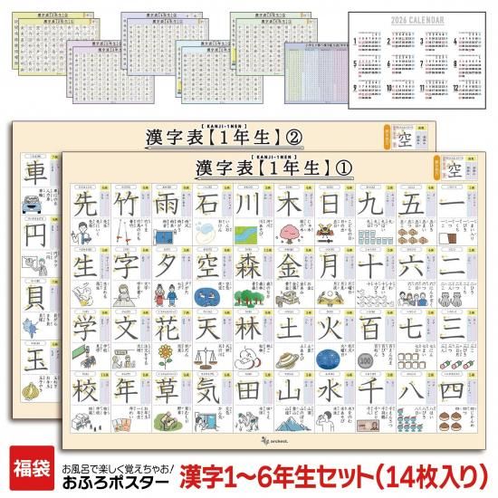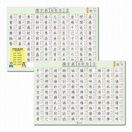 ■内 容:カレンダー1枚、漢字1年生2枚、漢字2年生2枚、漢字3年生2枚、漢字4年生2枚、漢字5年生2枚、漢字6年生2枚、漢字配当表1枚