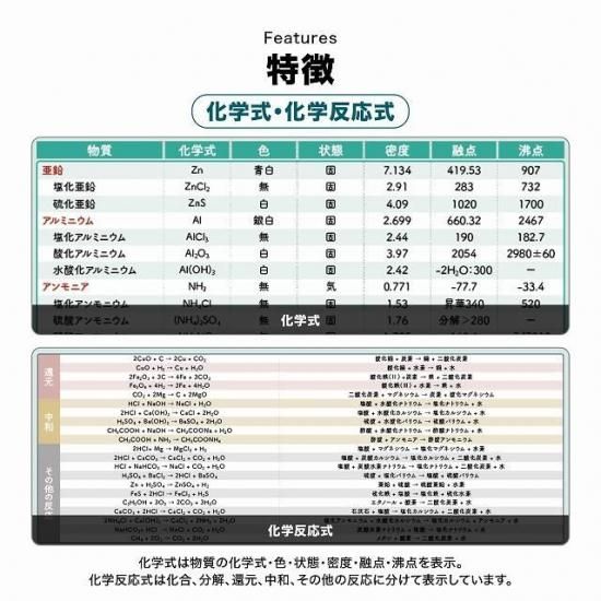 化学反応式は化合、分解、還元、中和、その他の反応に分けて記載しました。