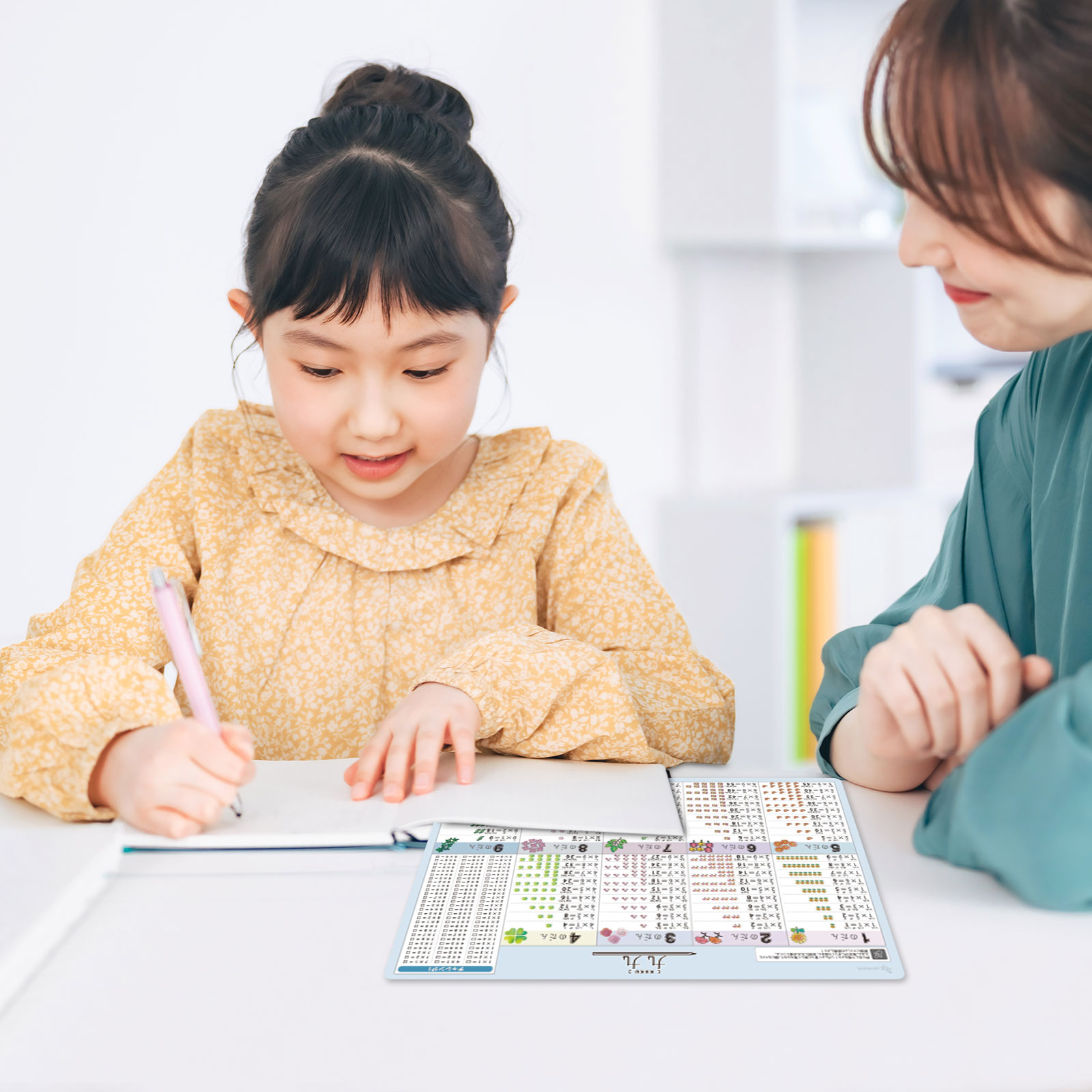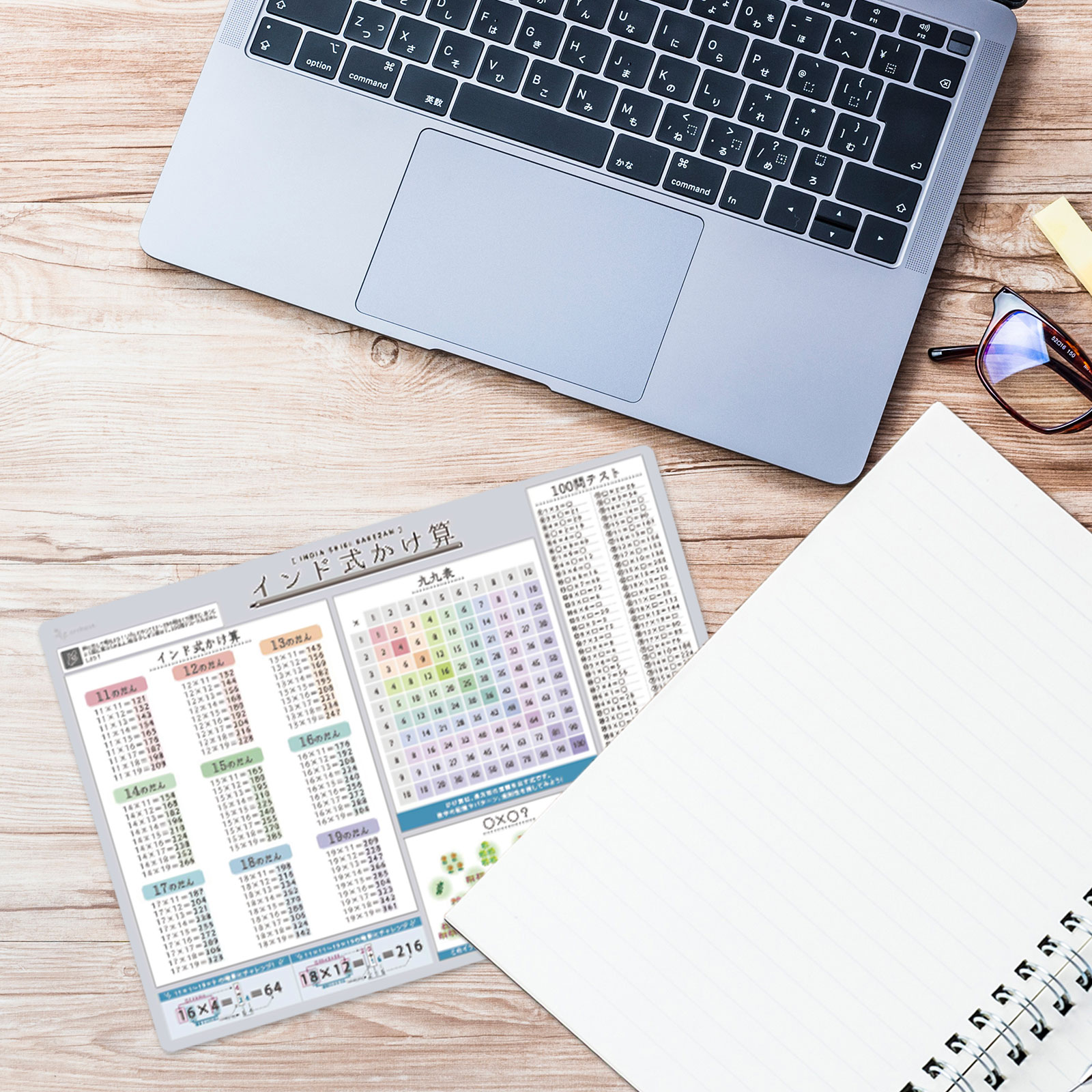 九九とインド式かけ算を一覧にまとめた下敷きです。机に置いていつでも確認できるよう、見やすく整理されたデザインに仕上げました。九九の段やインド式かけ算の計算手順を直感的に理解できるよう工夫されており、色分けや段ごとの区分で視覚的に整理されています。家庭学習や授業のサポートはもちろん、毎日の練習や復習、速算力向上の練習にも幅広く活用できます。