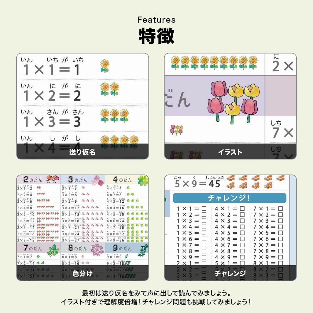 1の段~9の段までの九九をわかりやすく整理した下敷きです。段ごとに色分けされ、読みやすいフォントで暗記や練習に最適。九九の覚え方のメッセージも掲載され、楽しみながら計算力を身につけられる構成になっています。家庭学習や授業での復習、毎日の練習にも活用できます。