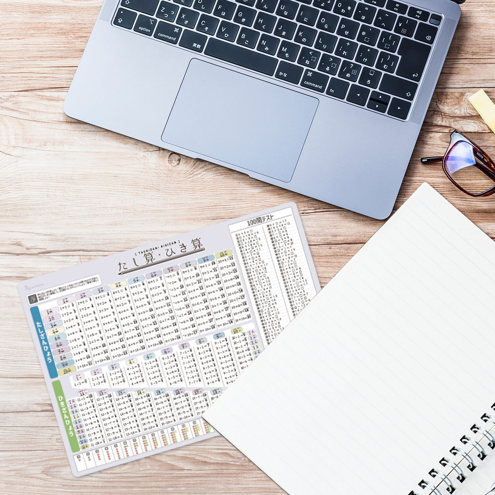 数字の基礎からたし算・ひき算までを一覧にまとめた下敷きです。机に置いていつでも確認できるよう、見やすく整理されたレイアウトに仕上げました。1~100までの数字や、1桁・2桁の計算のしくみを直感的に理解できるよう工夫されており、数の大きさや計算手順が視覚的に整理されています。算数の基礎学習や家庭学習のサポートはもちろん、毎日の練習や計算の確認など、幅広い学習シーンで活用できます。